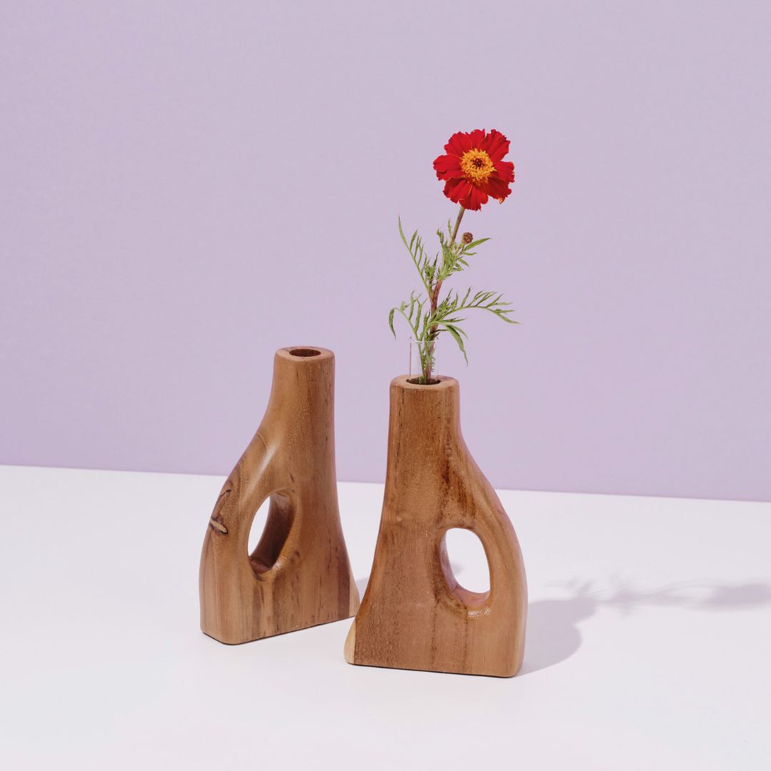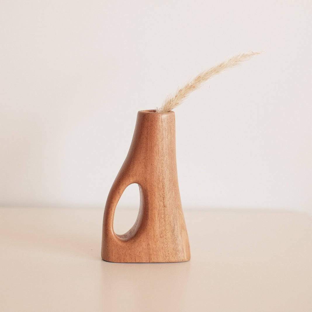 Crafted from reclaimed teak wood, it features a removable glass tube to hold your favourite fresh or dried flowers while keeping the wood dry. Perfect for your bedside, desk, or shelf, this piece embodies minimalism, mindfulness, and meaningful design.