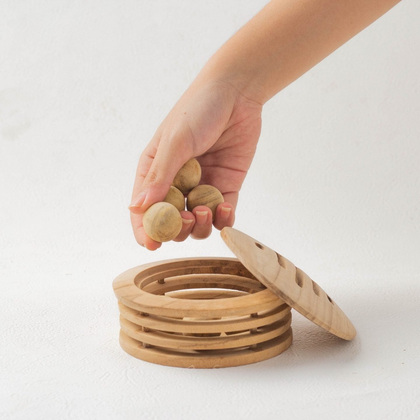 - Add 3โ5 drops of fragrance oil onto the wooden balls.